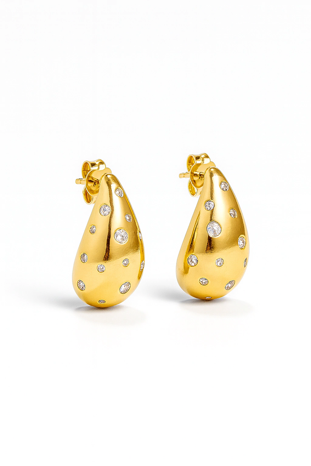 Brinco Gota Cravejada – uma semijoia sofisticada que une design moderno ao brilho atemporal. Seu formato orgânico em gota é realçado por cravação de zircônias delicadamente distribuídas, criando um efeito luminoso e elegante. Produzido em semijoia com camada de verniz protetor, é perfeito para quem deseja destacar o look com um toque de sofisticação.
